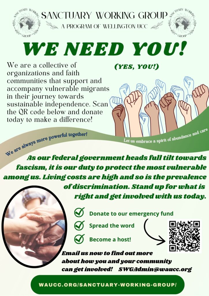 Since March of 2020, the Sanctuary Working Group (SWG), now a program of Wellington United Church of Christ (WUCC), has offered accompaniment support to over 600 migrants—both families & individuals—from primarily Africa, Latin America, and the Caribbean, and Central-East Asia.
