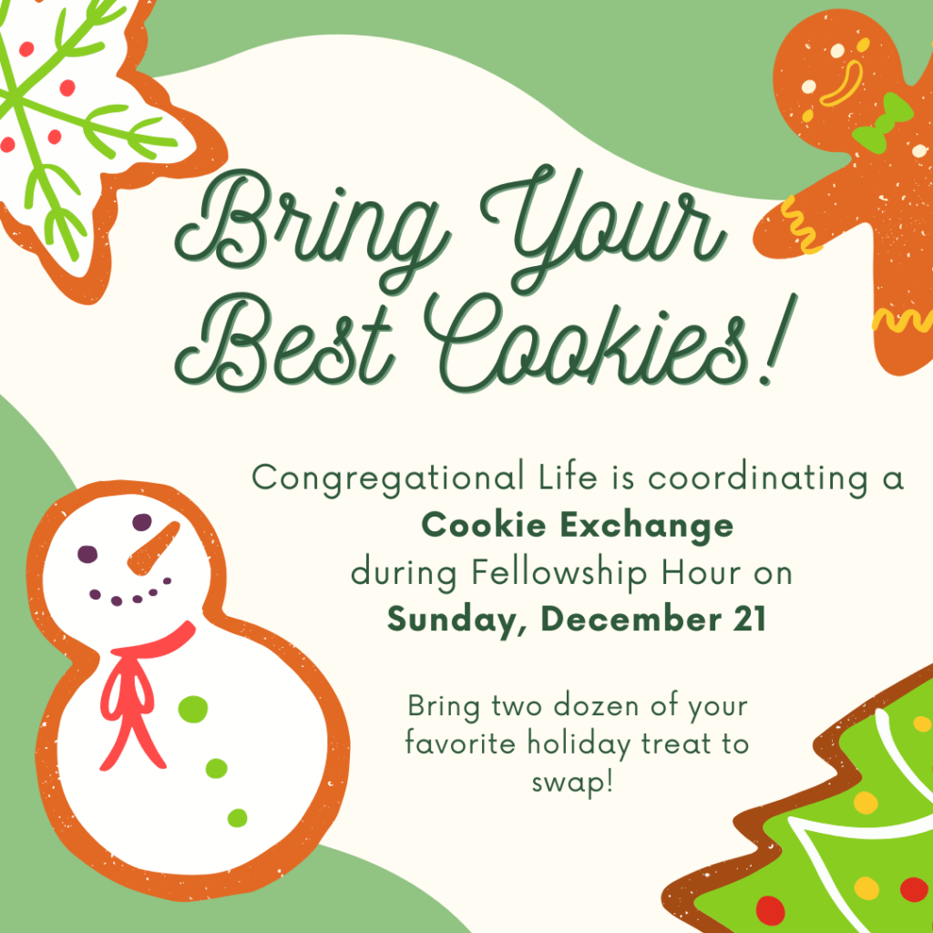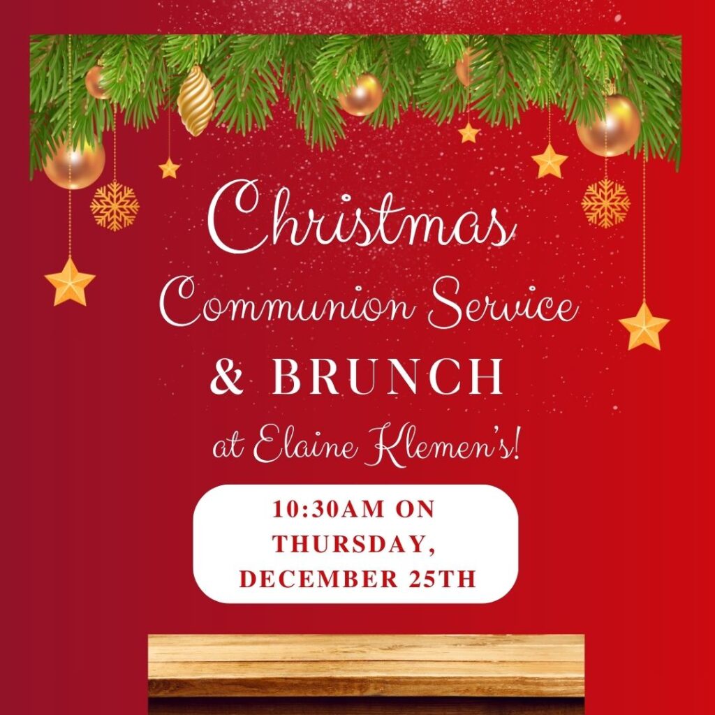 On Christmas Day, we will gather once again in person at Elaine Klemen’s home. After a brief worship service with Communion – and plenty of singing – we’ll enjoy a potluck brunch.